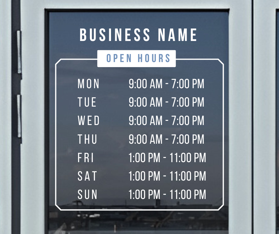 Add this sleek & easy-to-read business hours decal to your store or office entrance. Made from high-quality vinyl, it features customizable business hours in sharp, bold lettering that is visible from a distance and comes with easy stick on transfer paper for a quick install.